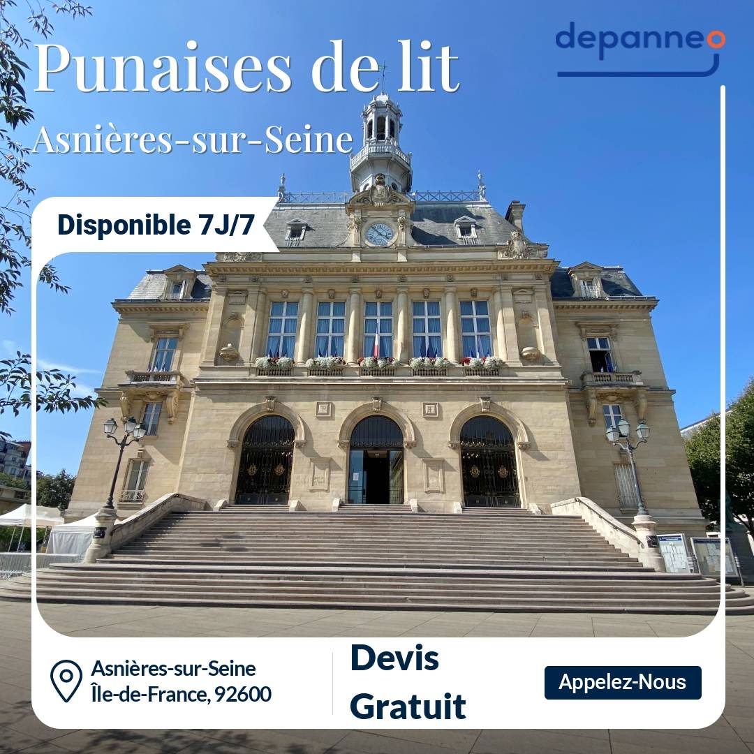 01 84 80 98 07Vous cherchez un exterminateur expérimenté dans l’hypercentre, aux Courtilles, à Bécon-les-Bruyères, aux Grésillons ou aux Sablons ? Vous cherchez le meilleur artisan possible dans les Hauts-de-Seine pour une extermination de punaises de lit à Asnières-sur-Seine ? Depanneo vous aide ! Quelle que soit votre zone de résidence en Île-de-France, vous avez la possibilité de bénéficier de l’assistance du professionnel le plus compétent, le plus renommé, le moins onéreux, le mieux outillé et le plus près de votre domicile. Une prestation en 24 heures est possible, peu importe la rue dans laquelle vous vivez : rue des Bas, rue du Château, rue de Bretagne, rue de la Concorde, rue des Mourinoux. En nous contactant dès maintenant, vous pouvez bénéficier gratuitement d’un devis.