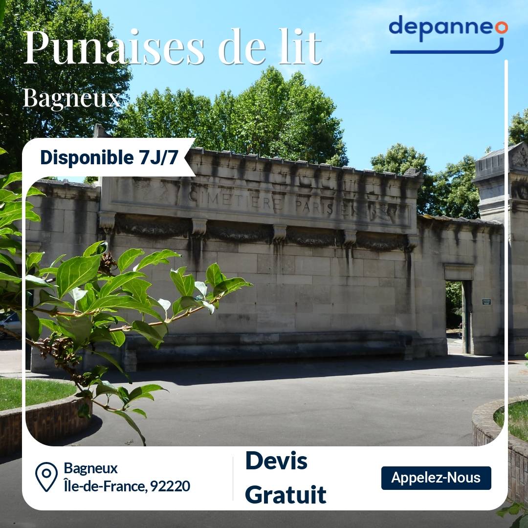 01 84 80 98 07Notre service d’élimination des punaises de lit à Bagneux est actif dans l’intégralité de la ville, de la rue de la Mairie à l’avenue Aristide Briand, en passant par la rue des Blains, la rue du Docteur Charcot et la rue des Tertres. Nos experts vous assurent un résultat à la hauteur de vos espérances pour toute demande d’extermination de parasites. Les professionnels de l’élimination d’insectes de notre service Depanneo mettent en œuvre diverses techniques pour tuer ces nuisibles. Ils utilisent par exemple des insecticides professionnels certifiés par l’État pour une extermination conforme aux normes en vigueur. D’autres techniques efficaces sont à leur disposition comme le traitement à chaud, le traitement à froid ou l’aspiration. Appelez-nous pour plus de renseignements et un devis gratuit !